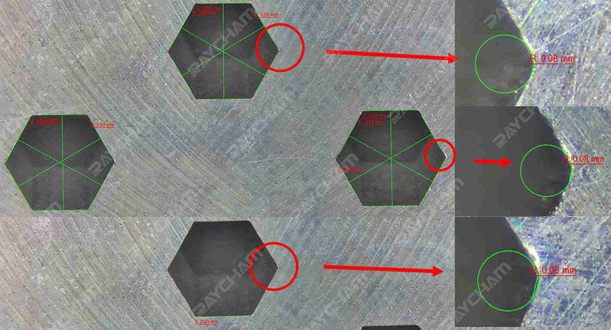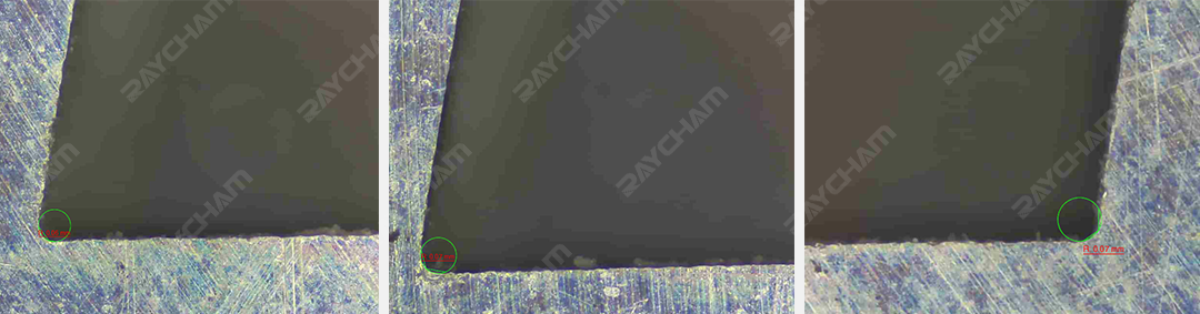 經(jīng)參數(shù)優(yōu)化,槽側(cè)壁表面粗糙度可以達(dá)到Ra1.2左右。相鄰面之間的過(guò)渡圓弧僅在0.06mm左右。切割表面無(wú)熱影響區(qū),重熔層可以保持在3μm以下。