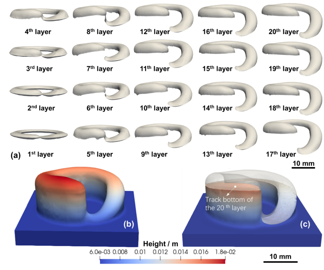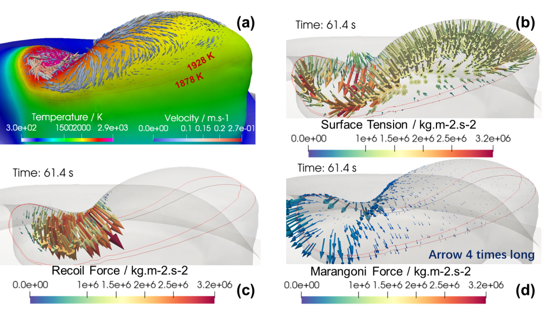 該研究揭示了激光增材制造過程中熔池內(nèi)部作用力對沉積偏差的影響機(jī)制,在介觀尺度探明了蒸汽反沖壓力、表面張力、熱毛細(xì)力在不同傳熱條件下對熔池形態(tài)的具體作用,繼而闡明了封閉路徑結(jié)構(gòu)在掃描路徑處產(chǎn)生偏差的根本原因。